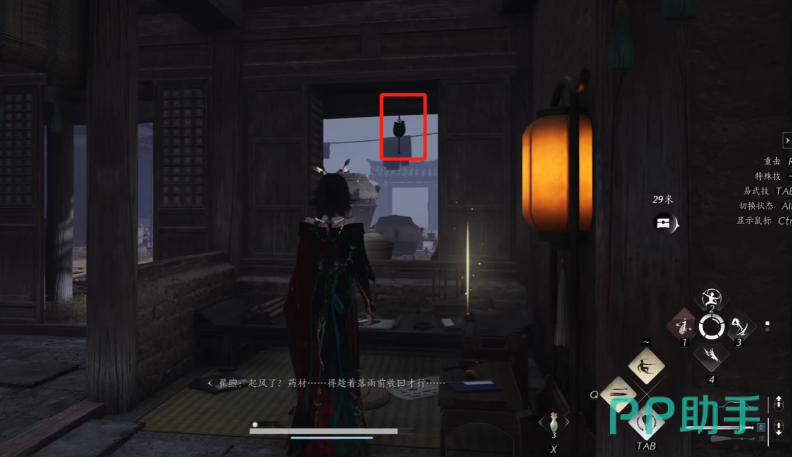 1、这个人物需要玩家去寻找三张药方,其实获取方法还是很简单的。第一张药方获取地方在开封城的最东边有个物资,在屋子外面用点穴奇术敲响屋檐下的风铃,此时NPC会被声音吸引走出去,然后在灯笼这个位置可以拿到第一张药方。