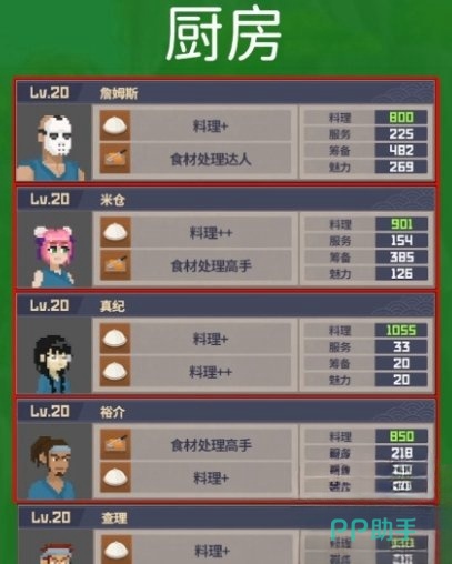 在厨房配置方面,烹饪效率与菜品质量至关重要。真纪以其卓越的料理属性成为首选,尤其在菜肴复杂度逐渐提升时,她能够大幅提升餐厅的出品水平。作为真纪的优秀搭档,詹姆斯凭借解锁高级菜谱的能力和高性价比,能够承担厨房的主力工作。而拉乌尔的稳定表现和灵活性也使其成为重要补充,适合与詹姆斯搭配使用。如果需要更具灵活性的选择,米仓也可以作为备选厨房员工,为餐厅提供额外的烹饪支持。