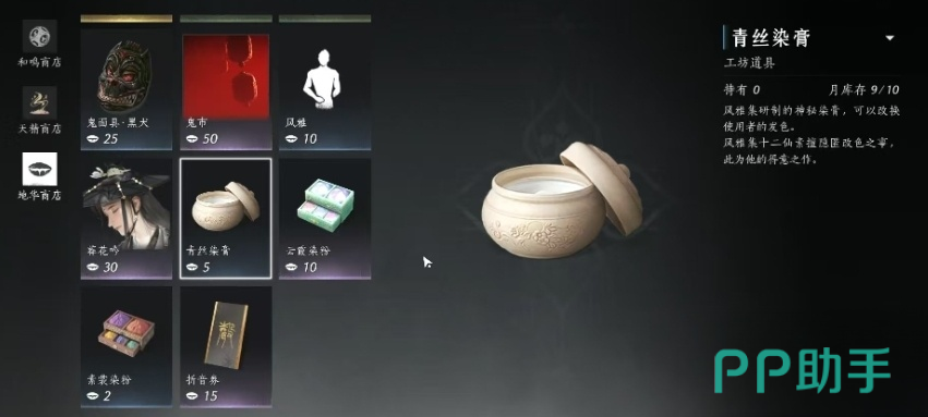 在染色界面,玩家可以看到可染色的服装和发型,此时,可以使用游戏中的染膏进行颜色调整。青丝染膏可以在地华商店、江湖百珍商店和赵飞烟私库购买,适用于基础颜色的调整;凝华染膏则在和鸣商店购买,用于高级颜色的调制。每种染膏都有不同的颜色选择,玩家可以根据自己的喜好进行搭配。