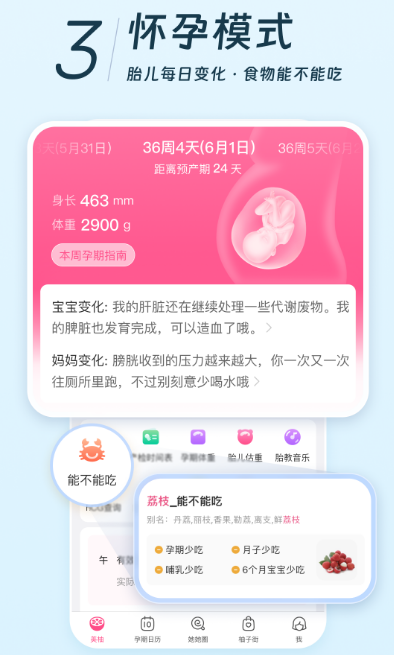 比男朋友更懂你的贴心app拥有四大模式,包括经期、备孕、怀孕、育儿小伙伴们可以在不同的阶段切换不同的模式。助力你科学备孕,安全怀孕。根据自己的实际情况推算出具体的怀孕周期,并推算出预产期。每天每周都会利用具体的科普方式,让所有孕妇详细了解宝宝的变化以及妈妈的变化,另外还有能不能吃胎儿评估以及胎教音乐等丰富的内容。