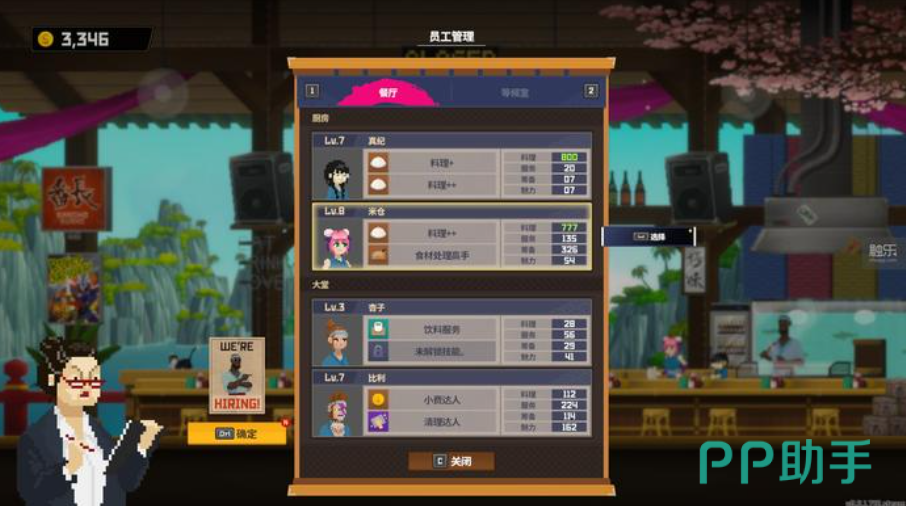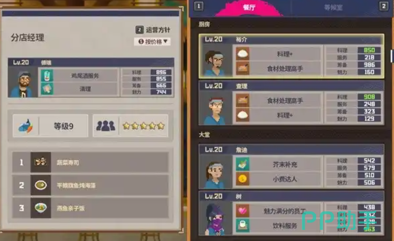而在大堂经理的选择上,其实最重要的是清理度,小编建议大家在每个店放两名清理度拉满的员工,因为大家在游戏的过程中会发现脏盘子一直都是扎堆出现的,如果你只有一个能力拉满的员工,其实是来不及清理的,这就会导致很多客人都跑掉了,因此小编建议大家直接放两个,至于鸡尾酒技能可以放在后面考虑。