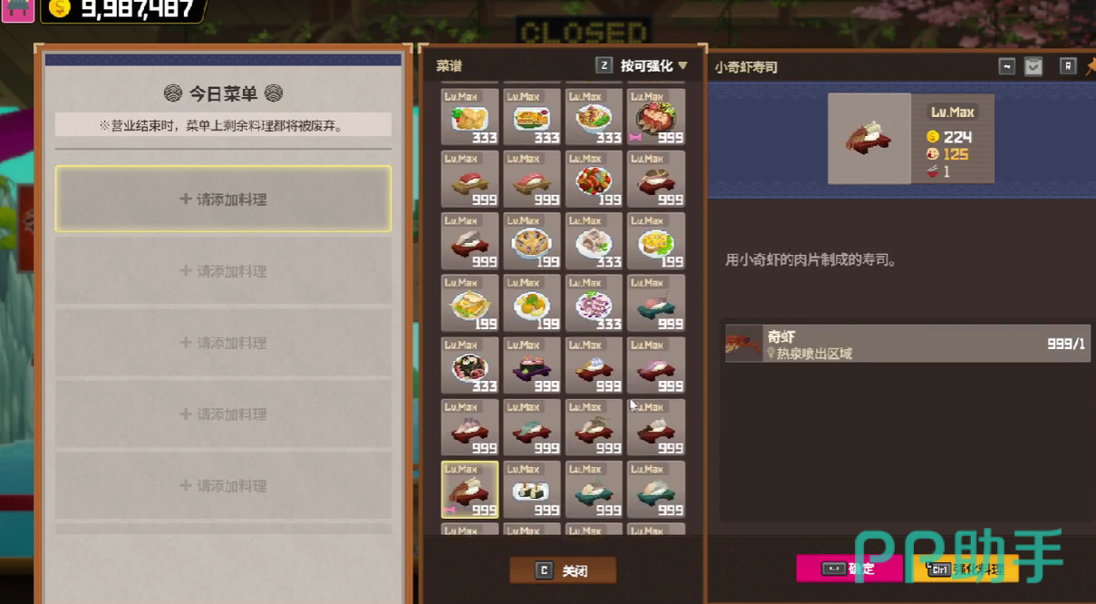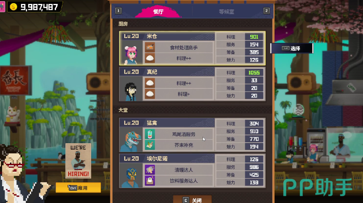 厨房方面,可以直接选用真纪或米仓,真纪制作寿司的能力会高于猛禽,固然在游戏内,玩家的分店可以用于专门制作日式或韩式的料理,而主店可以制作一些综合性高的料理。