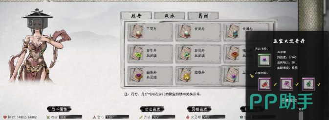 第二个丹药是五宝大还丹,在游戏当中五宝大还丹能够让一丝元魂的角色完成肉身重塑,简单的就是说就是可以复活别人。目前这个丹药的获得方法还是比较简单的,可以前往云陌州主城工坊进行炼制,不过主城的名字和位置是不一样的。玩家可以在小地图当中直接寻找主城标志进入即可进入到工坊后,点击五宝大还单的单方。在下方凑齐3750灵石,30个胭脂安息香、月阳根和五爪藤就可以开启五宝大还丹的炼制。