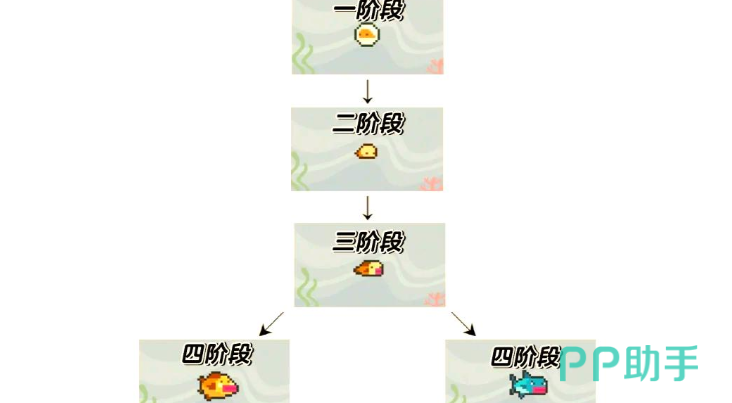 根据成长进程,阶段被分为幼体、鱼苗、小鱼。在小鱼期,玩家们需要确保它们的饱食度和娱乐度,如果处于一级或者二级的话,它们就会变成蓝色小鱼,如果处于三级和四级会变成黄色或者红色的小鱼。在成鱼阶段,有概率会出现4种特别的鱼,黄色的有可能会进化为海牛和白鲸,蓝色的可能进化为五彩鳗和柠檬鲨。其中海牛和五彩鳗需要在进化之前确保达到1级饱食度和娱乐度,9点培训值。白金和柠檬鲨需要达到二级或者三级的饱食度和娱乐度,以及9点培训值。