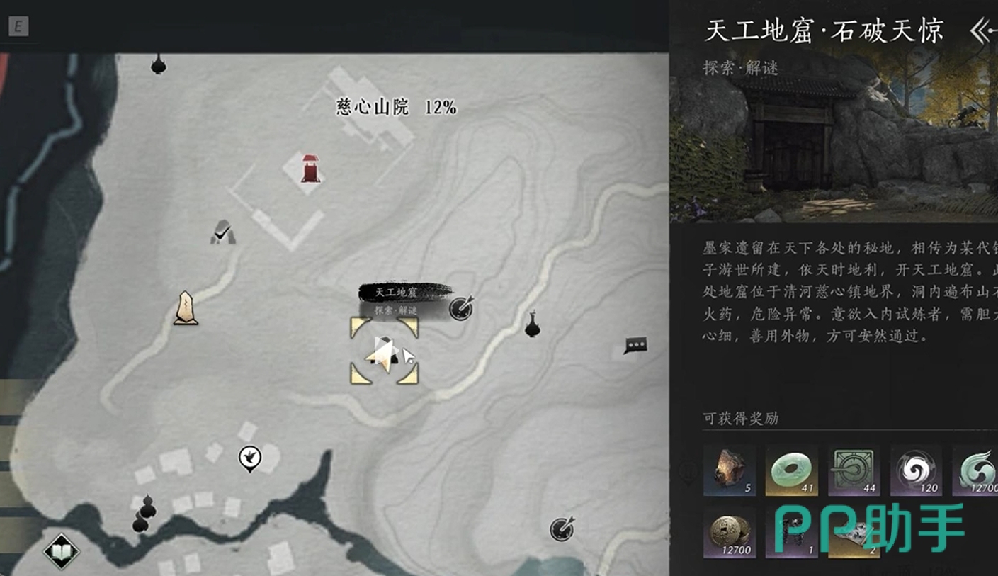 首先,“石破天惊”关卡的具体位置位于慈心山院传送点的右侧。一旦进入这个关卡,玩家将遭遇一系列解谜和战斗的挑战。首先,玩家需推动机关以开启地窟大门,然后继续前行,会发现一个木制机关。启动该机关后,玩家将获得一个炸药桶,利用这个炸药桶可以炸开旁边的入口,从而获取第一个宝箱。