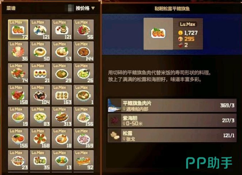 旗鱼料理分为酱烤条纹四鳍旗鱼、平鳍旗鱼炖海藻两种,分别需要四鳍旗鱼和平鳍旗鱼作为主素材,其他材料还需要大蒜、大酱、南部黄牛昆布、甘苔、酱油等辅助材料,南部黄牛昆布需要在冰河区域开启后传送过去收集,酱油通过员工派遣的红色料理锅概率获得,平时也应该注意收集这些辅助材料,让料理的制作更加轻松。