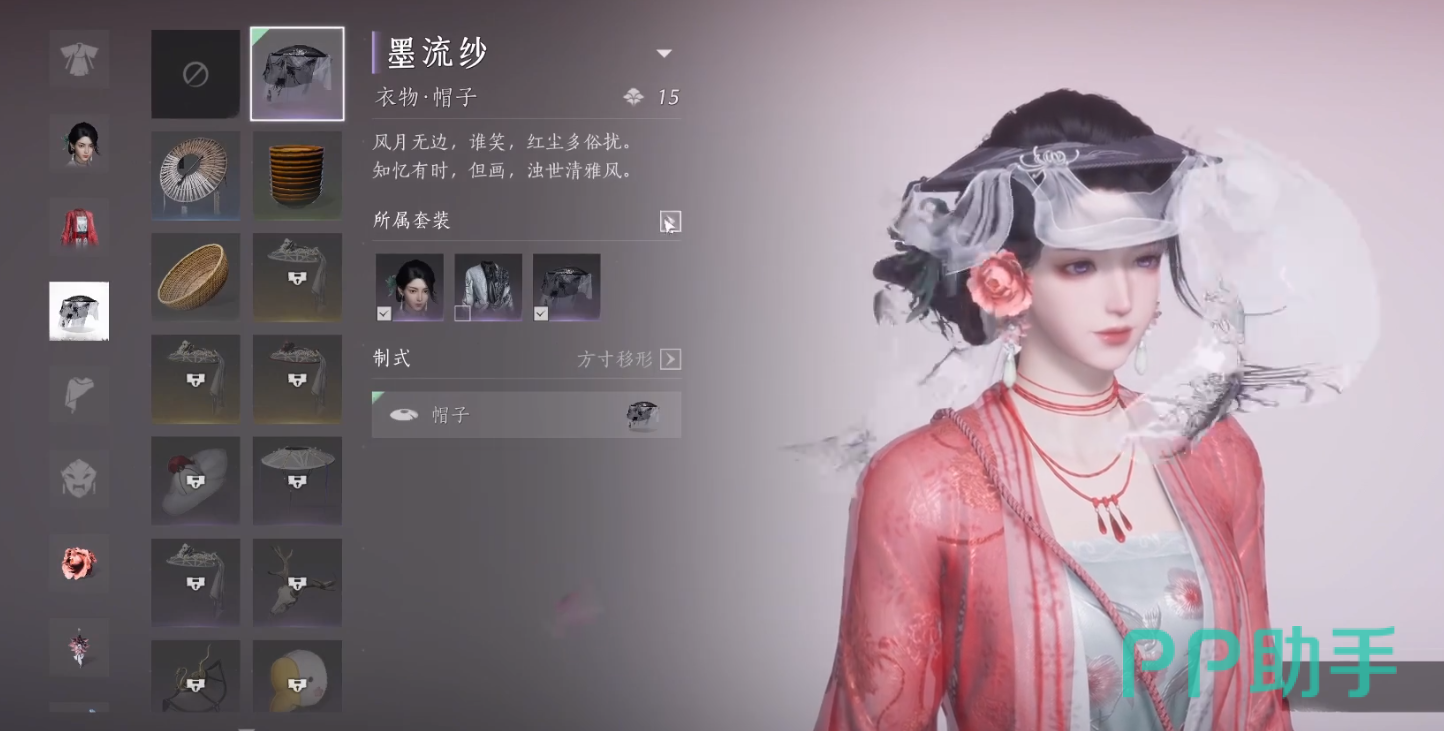在游戏中,玩家可以进入外观界面,点击帽子图标查看已解锁的帽子外观。部分帽子外观可以通过游戏内的商店,用长鸣珠直接购买,而在初始阶段玩家也有基础款外观,比如墨流纱这一经典古风帽。