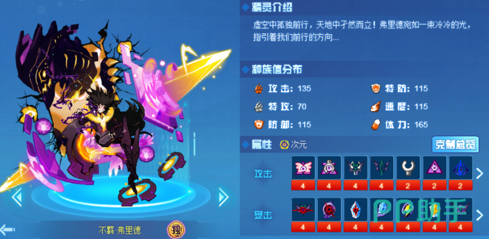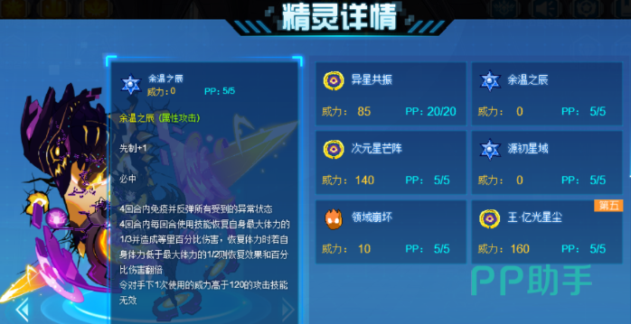 它拥有强大的控场输出能力十分适合pvp,它的专属特性能在当回合未击败对手的情况下,让自己的随机三项属性+1,且50%概率让对手害怕,为成功触发害怕时则50%概率触发瘫痪,当该回合成功击败对手还会吸取下一个出场对手的最大体力并且全属性+1,它的第五技会消除掉对手回合类效果,成功后在接下来两回合内敌人无法通过技能来回复体力,并附加对手自己最大体力20%固定伤害,每次使用增加10%最高能加到40%;