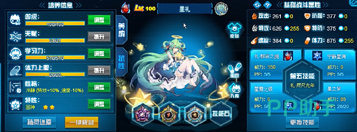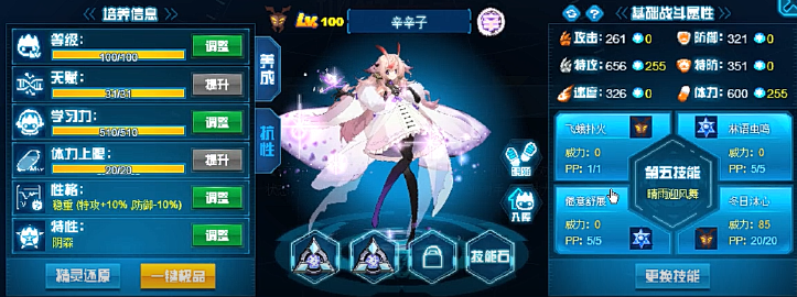 最后咱们对战斯凯普。它每个回合全属性+1,直接攻击技能可以清空我方一个PP技能,还有着一定概率可以挡伤。咱们在对付它的时候需要带足6个精灵才行,因为它会清PP,所以咱们所带的精灵全部输出能力都要很高,且输出技能也比较多才行。