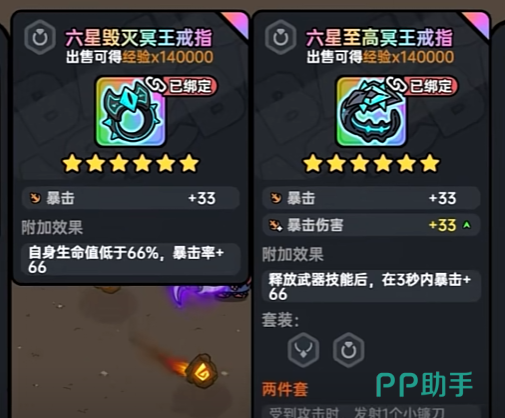 至高冥王戒指:这枚戒指以其高额的暴击率和暴击伤害加成而著称。佩戴后,玩家在战斗中能够更频繁地触发暴击,造成巨额伤害。同时,至高冥王戒指还拥有在释放武器技能后短时间内增加暴击的特殊效果,为玩家提供了爆发性的输出能力。