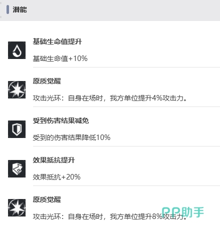 攻击上升的效果使队友的攻击力提升40%,让他们在接下来的战斗中能够造成更高的伤害,而防御上升效果则使队友的防御力提升60%,有效减少来自敌人的伤害,这两个增益效果的结合就代表了杜兰铎最强的效果,随着杜兰铎等级的提升,在等级2时她的生命值将永久增加3%,等级3时生命值再次增加3%,当达到等级4时生命值第三次增加3%,最终在等级5时,她的飞天轮舞技能冷却时间将减少1回合,此时她的生存效果才是最强的时候。