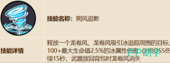 首先了解一下这把武器的基础性属性,移动速度可以增加100,会有250点冰攻击,一旦在释放攻击之后就可以把周围的敌人全部都吸附柱。朔风追影这一个技能一旦在释放之后还会形成一个龙卷风,会有15秒的时间。基本上每相隔半秒就会造成将近100点的基础性伤害,而且还会有冰属性伤害。