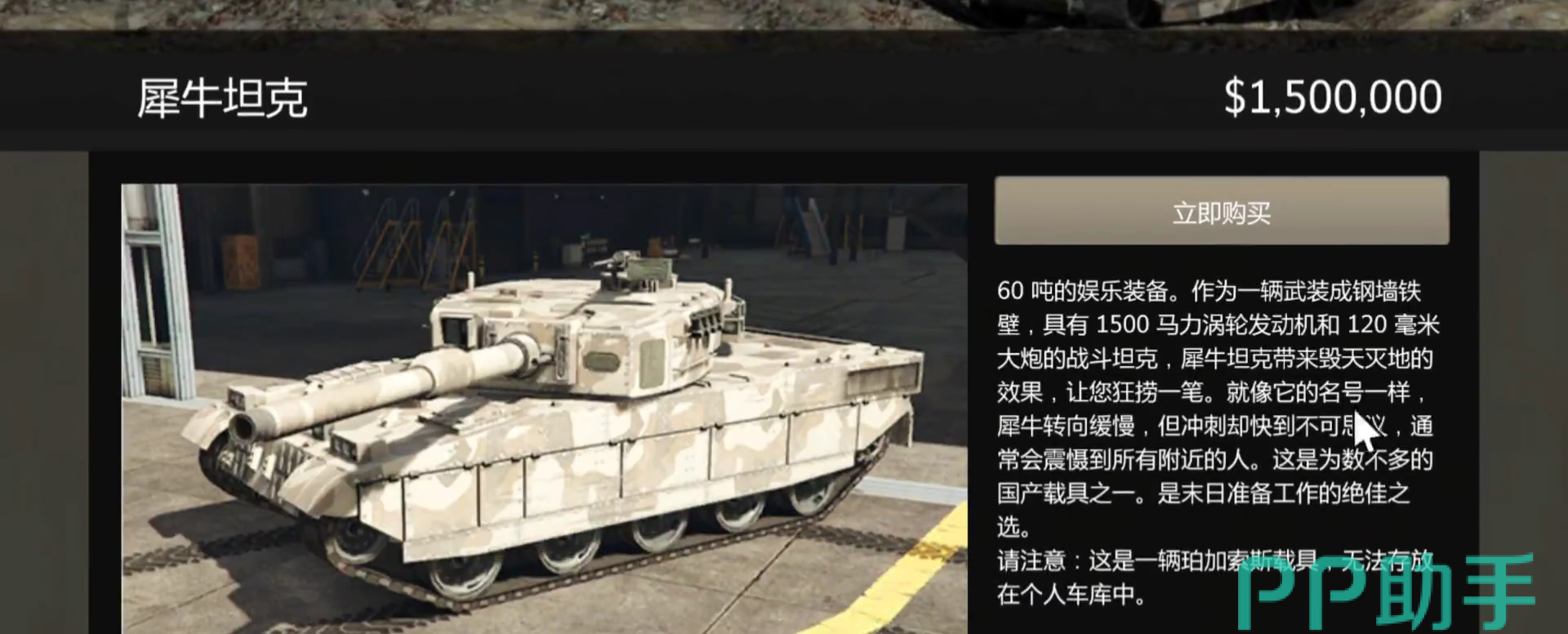 大家可以通过完成主线任务来解锁坦克的购买权限,当主线任务进行到一定程度后,便可以在游戏的官方网站上购买坦克。但注意的是购买后的坦克并不会像普通汽车那样存放在你的车库中,而是需要停放在老崔的机库里。因此当你找不到坦克时,不妨去机库看看。另外PC玩家可以通过输入秘籍代码‘’1-999-872-433”1,输入后即可以召唤一辆坦克到当前位置。