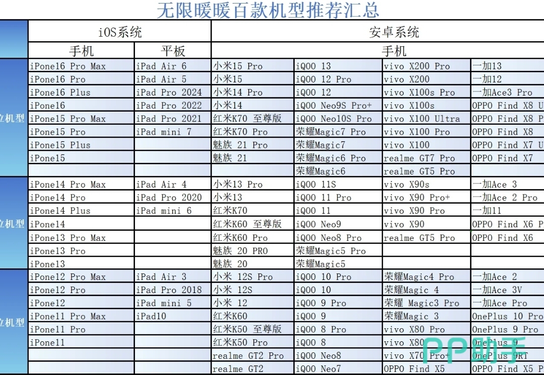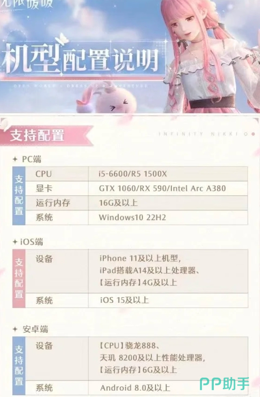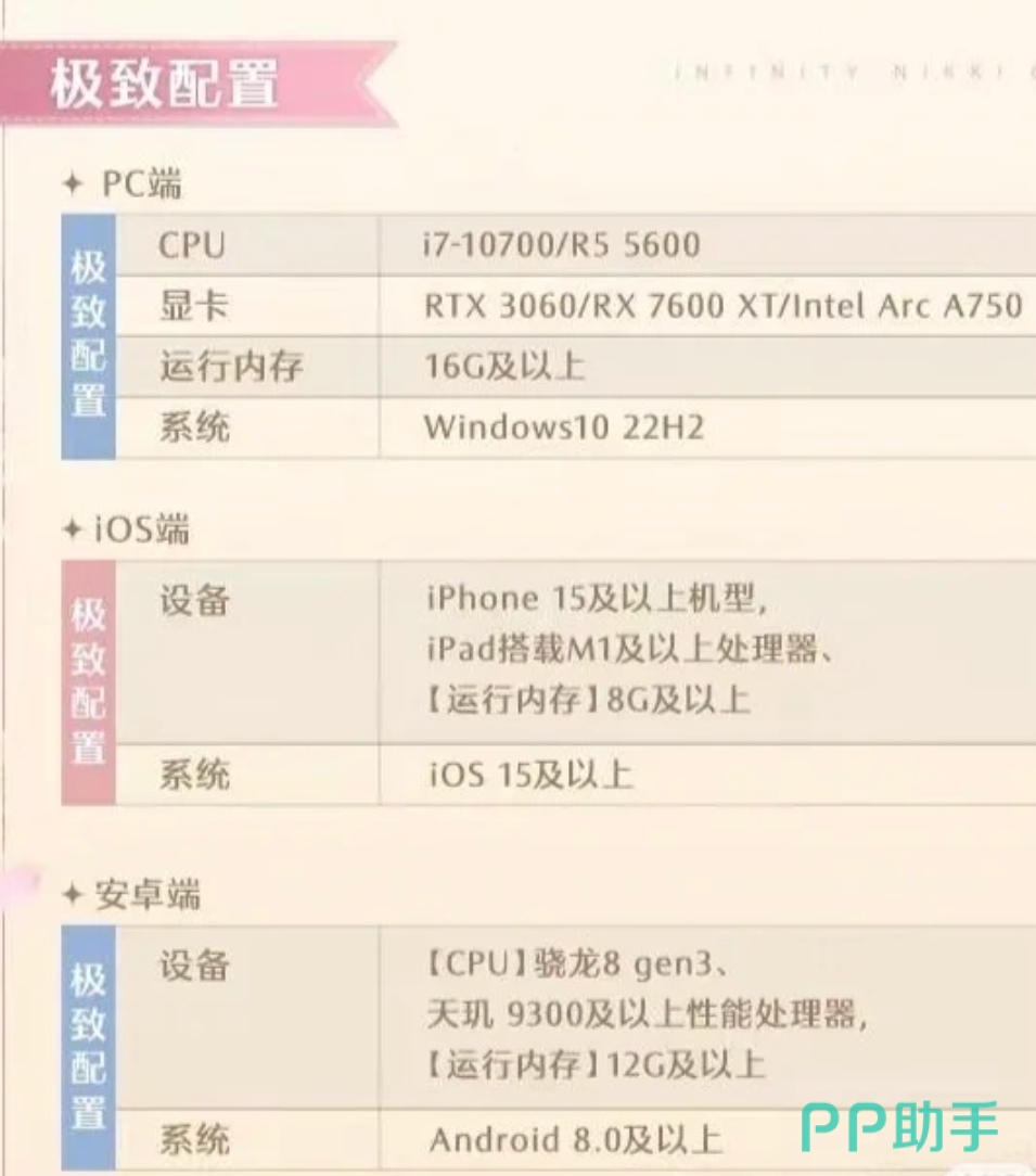 先和小伙伴们分享的是苹果机型,无限暖暖已经出了最低苹果手机的配置要求。小伙伴们如果用的是苹果手机,暖暖对于苹果最低要11版本的手机才能带动游戏哦!想要更好的体验就是苹果16pro版本了,平板最低是苹果mini7。