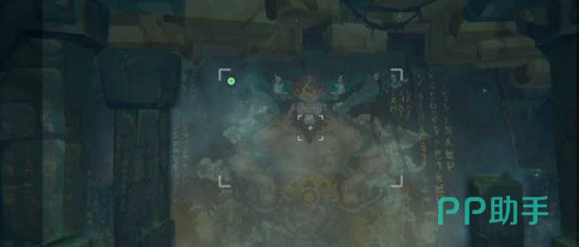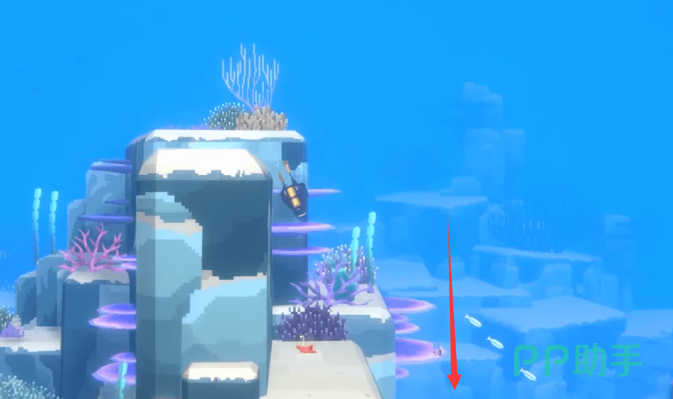然后一直向右边走,会进入到一片比较广阔的海域,这里要想着右下角的方向游,这样会穿过一个像是海沟的地方,一直往下到右下角这时我们会看到一个被石碓封起来的洞口,这里就是我们需要进入的鲛人族档案室了。