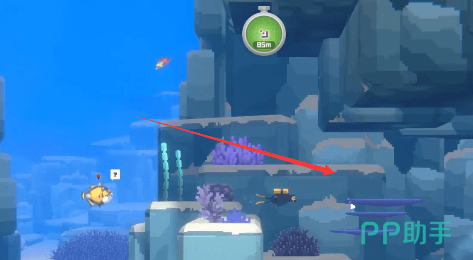 首先我们在接取这个任务后下海,往右下角游,这个时候会触发剧情我们渡过后,继续向下潜等看到一个岩石的位置,往岩石的右边小道区域继续下潜,向下到第一个路口的时候,向右边转弯。