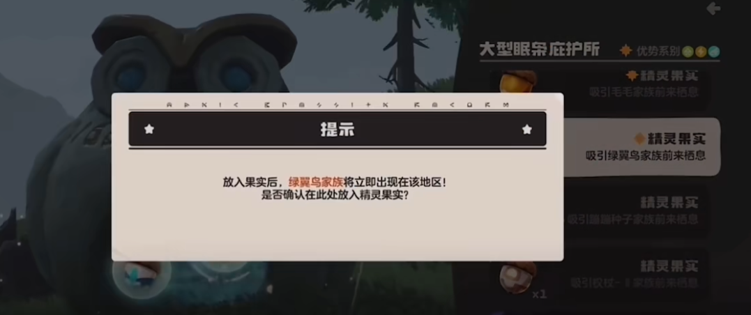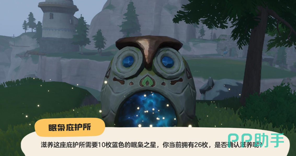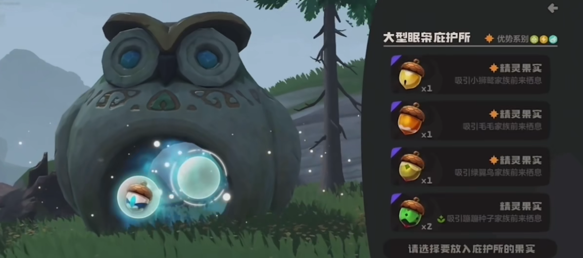 许多人在大地图中打开之后看不到眠枭庇护所,是因为这不会直接显示在地图上面。这时要不断进行地毯式搜索,当你发现一个猫头鹰形状的设施之后,就记得要在地图上留下一个标识。这样下次找时就不用费力搜寻,最后看到后让你所拥有的宠物果实放进去。