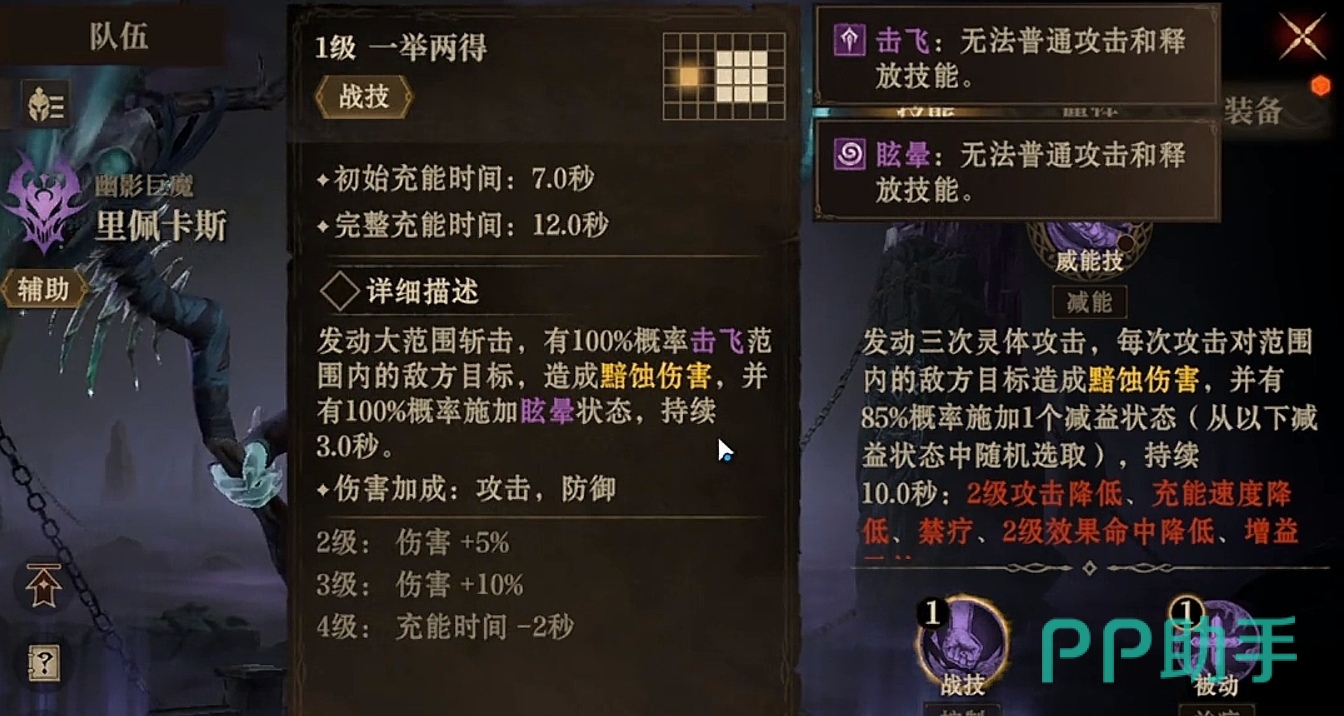 除了被动技外,里佩卡斯还拥有一举两得这个战技,可以发动大范围斩击,有100%的概率击飞范围内的敌方目标,并造成基于攻击力和防御力加成的黯蚀伤害。此外,还有100%的概率施加眩晕状态,持续3秒,实际的效果会随着技能等级提升。该技能还具有一些特殊的附加效果,能在一定程度上增加角色的战力。它的威能技幽灵戏耍,使用时会发动三次灵体攻击,每次攻击对范围内的敌方目标造成黯蚀伤害,同时有35%的概率减少目标的威能,并且有85%的概率施加一个减益状态。
