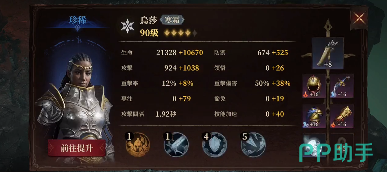 乌莎:乌莎是寒霜冰属性的输出角色,在副本中主要负责攻击手。她的装备应该以堆叠攻击力和防御力为主,防御力至少需要达到+500才能在副本中站得住脚。技能速度建议加到40,确保技能的释放频率。乌沙的威能技能是强力的范围输出,能够对敌方施加寒霜状态,并且对寒霜状态目标造成双倍伤害。这种技能特性使她成为高性价比的蓝色稀有度输出角色。当然,如果玩家手中有更高级的输出角色,也可以考虑用来替代她。