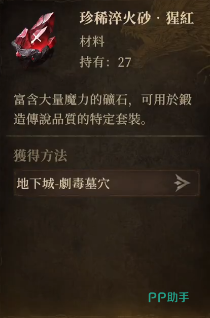 剧毒墓穴7是比较关键的装备本,因为玩家越早通过,就能越早收集到珍稀淬火砂·猩紅的材料,这个矿石材料可以锻造传说级别的装备,黄装可以精练到+20,是目前版本的顶尖套装。