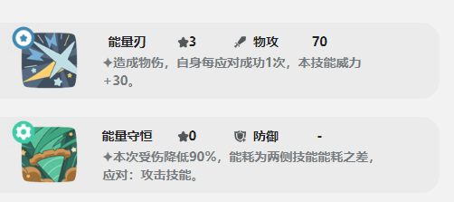 然后还有一个进攻技能叫做剁地,可以对敌方精灵造成物理伤害。然后还有防御技能—能量守恒,用了后可以降低90%受到的伤害,是一个关键的物理防御技能。然后还有空间压迫,能够造成物理伤害,并叠加一层星陨。