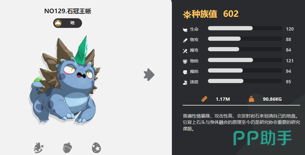 石冠王蜥是一个性情暴躁的狠角色,只要对方来到自己的地方的话,他就会无情的发射一些岩石碎块来攻击对手。以此来划清自己的地盘界限,而且将所有的石头都融入自己的身上。然后有着高额的生命值以及双攻,自身也拥有高额的物理防御,无惧各种天然灾害。