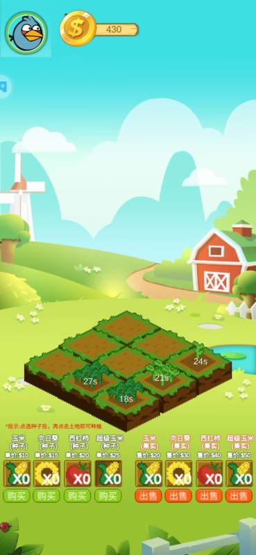 当你有一片小小的菜园,你会去种植什么样的植物呢?玩家的每天日常就是去管理好自己的菜园,种植一些符合等级的植物,比如说新手期可以种植小麦和玉米。等到等级提升后可以去解锁更高级的农作物。玩家还可以去修建池塘,获得更多的水产品,同时可以去养殖动物,增加自己多样化的商业收入。