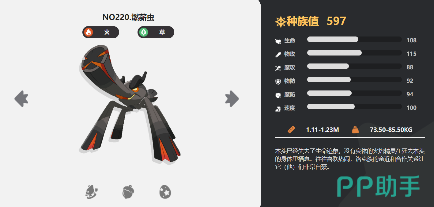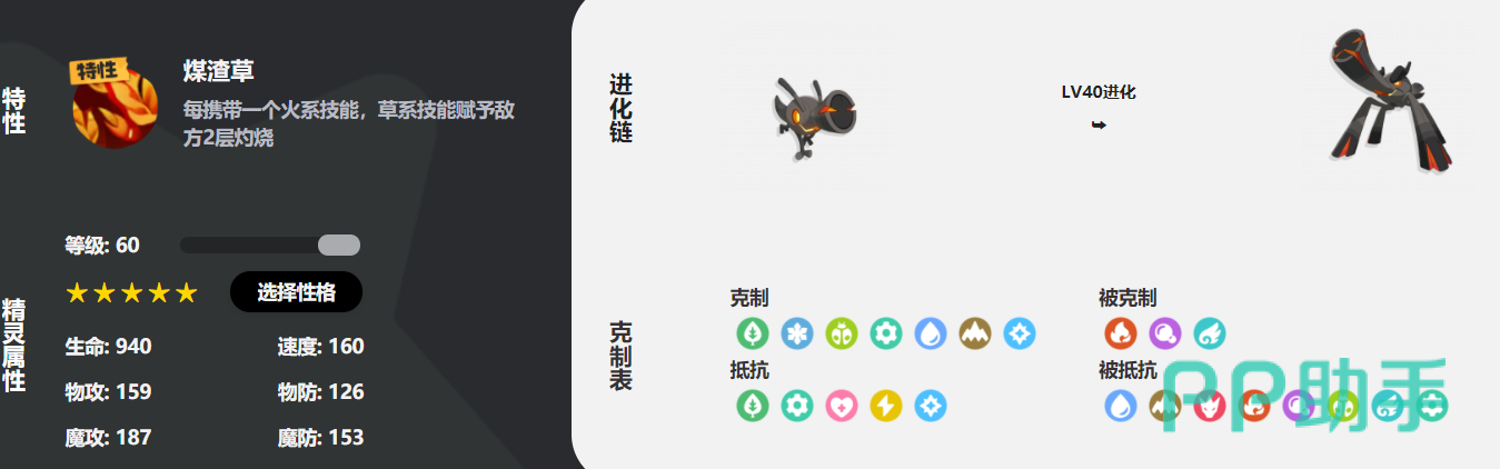 特性:煤渣草。燃薪虫每携带一个火系技能,草系技能便能额外赋予敌方2层灼烧效果。这使得燃薪虫在战斗中能够频繁叠加灼烧状态,为队伍创造更多输出机会。