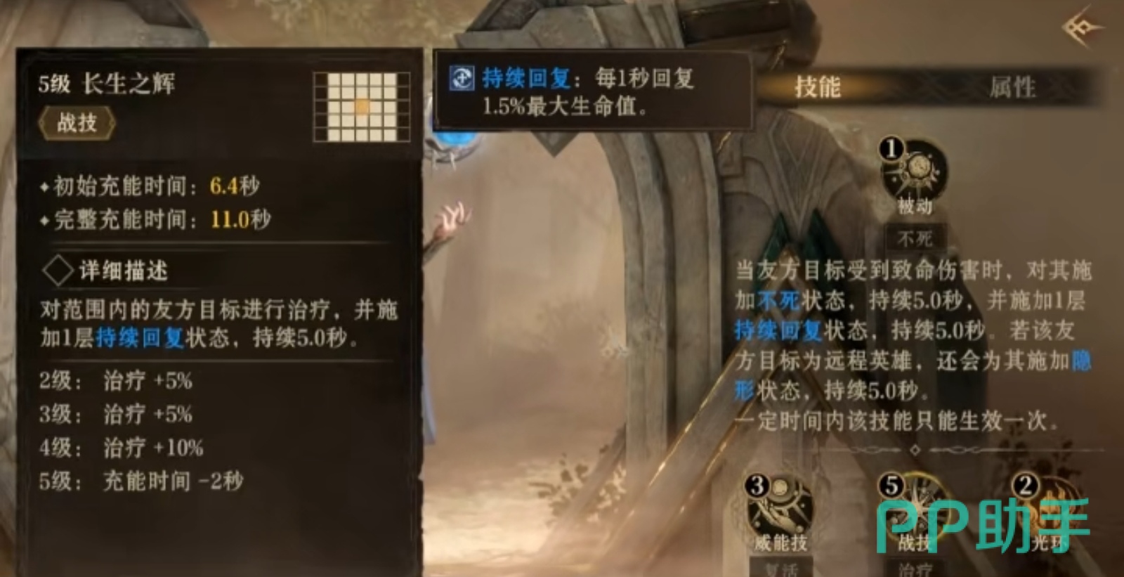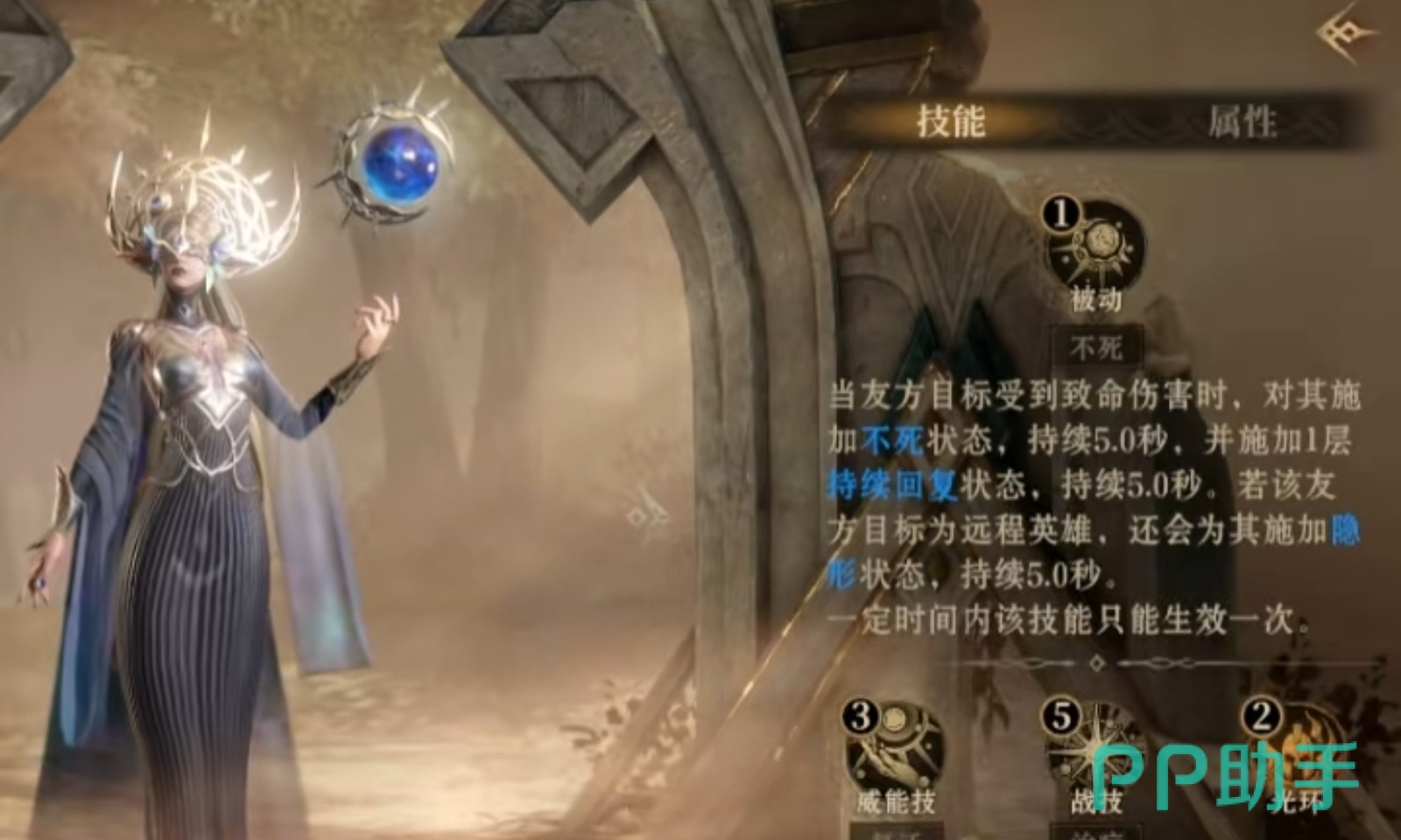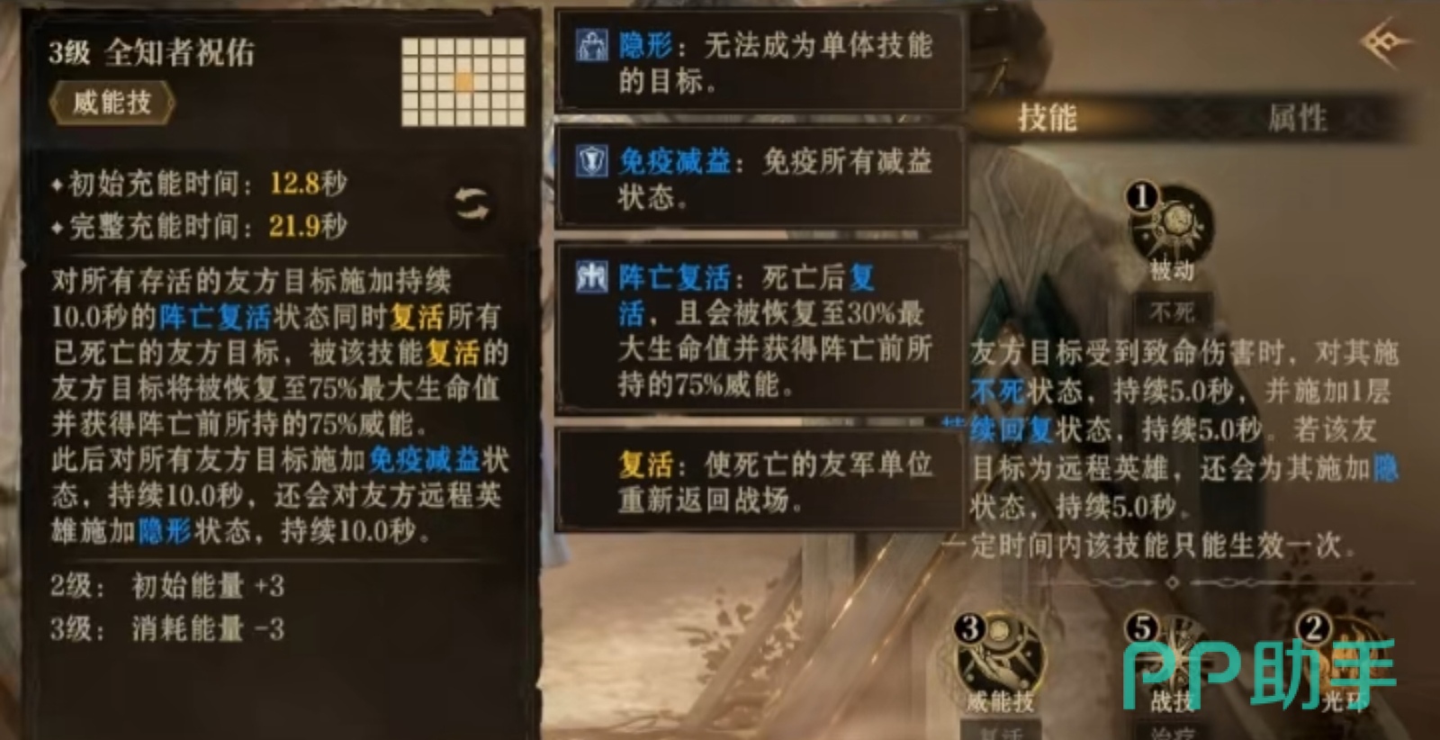 它的最终大招是威能技全知者祝佑,能对所有存活的友方目标,施加持续10秒的阵亡复活状态后,复活所有死亡的友方目标,被该技能复活的友方目标将被恢复至75%最大生命值并获得阵亡前所持的75%威能,此后对所有友方目标施加免疫减益状态,还会对友方远程英雄施加隐形状态,是一个集复活、恢复和免疫减益于一体的强大技能,在战斗中往往能扭转战局。