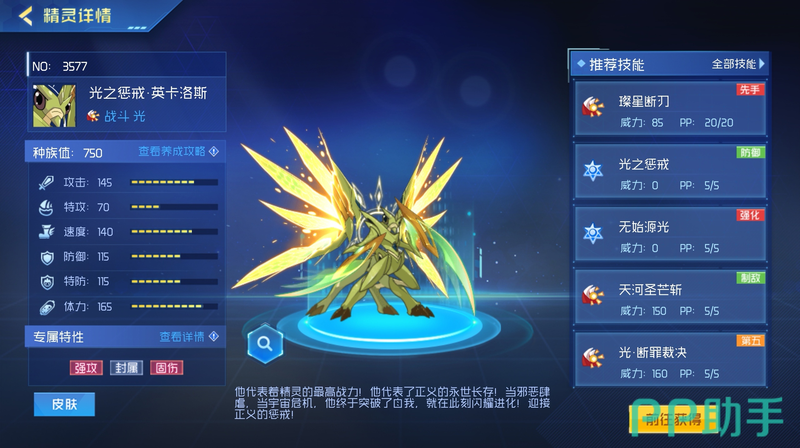 光断罪裁决是它的核心输出技能,威力高达160且必中,能够消除对手的能力提升状态,消除成功后的2回合内,对手无法通过自身技能恢复体力,要是用这招打败了对手,就能免疫下一次的遭受的攻击,就算没打败对方,也能使其陷入疲惫,同时提升自己的所有属性值。连续使用天河圣芒斩和璨星断刃,无视对手免疫伤害效果,要是敌人处在异常状态,威力还会加强,使用璨星断刃时,若自身满体力则技能威力提升100%,使用这招能打乱敌人的进攻节奏。