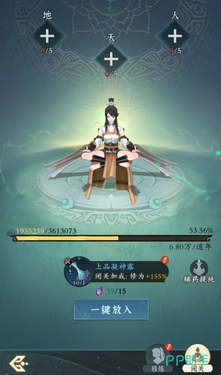 凝神露通过辅料来提纯,三瓶低品质就能合成一瓶高品质,同样推荐尽量使用蓝色以上的凝神露。闭关需要消耗九颗聚灵石,每闭关三次,需要使用的聚灵石就会增加三颗,小编的建议是每天闭关12颗的就直接停止,第2天重置之后再去修炼。还有一个小技巧要介绍给大家,那就是在当天境界临近突破这个阶段时,例如从筑基中期即将进入后期,那么先靠修炼突破再闭关,高一个境界给的灵气更多。
