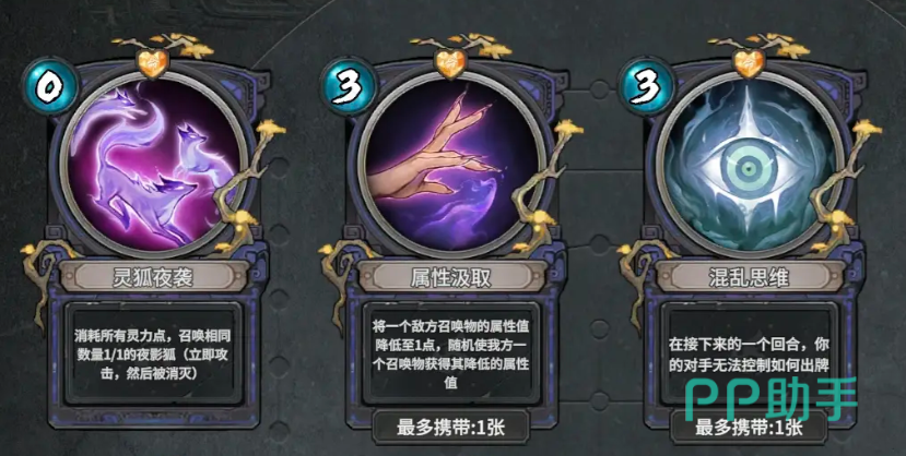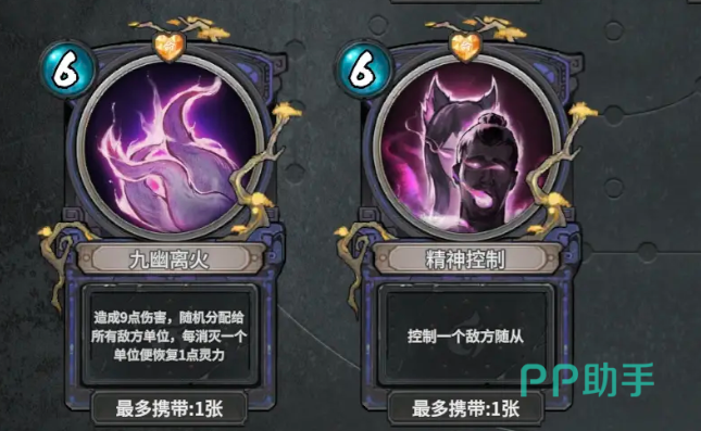 此外也可加入九尾灵狐卡牌,能够将所有的敌人随从攻击力降为一点。然后把它再一次放入你的牌库里,重新洗一遍。还有九幽离火,可以直接对敌人造成9点伤害。不过会随机分配给所有敌方单位,若是对方阵亡的话就可以恢复自身一点灵力。