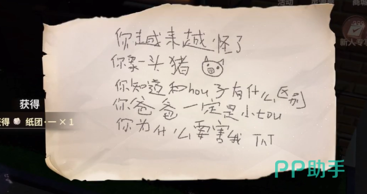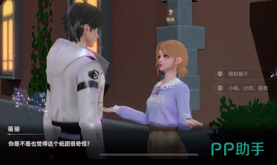 这个纸团的谜题有三个,第一个谜题的位置在城中心npc蓓丽附近的草丛,玩家们在草丛进行拾取的时候会获得一张乱七八糟的纸条,找到之后跟蓓丽进行对话,这时候npc会跟玩家们进行短暂的角落,在角落的时候会有两个选项,玩家们需要在选项中找出答案,选择猪和猴子的选项就可以了,这样第一天的谜题系列就能完成。