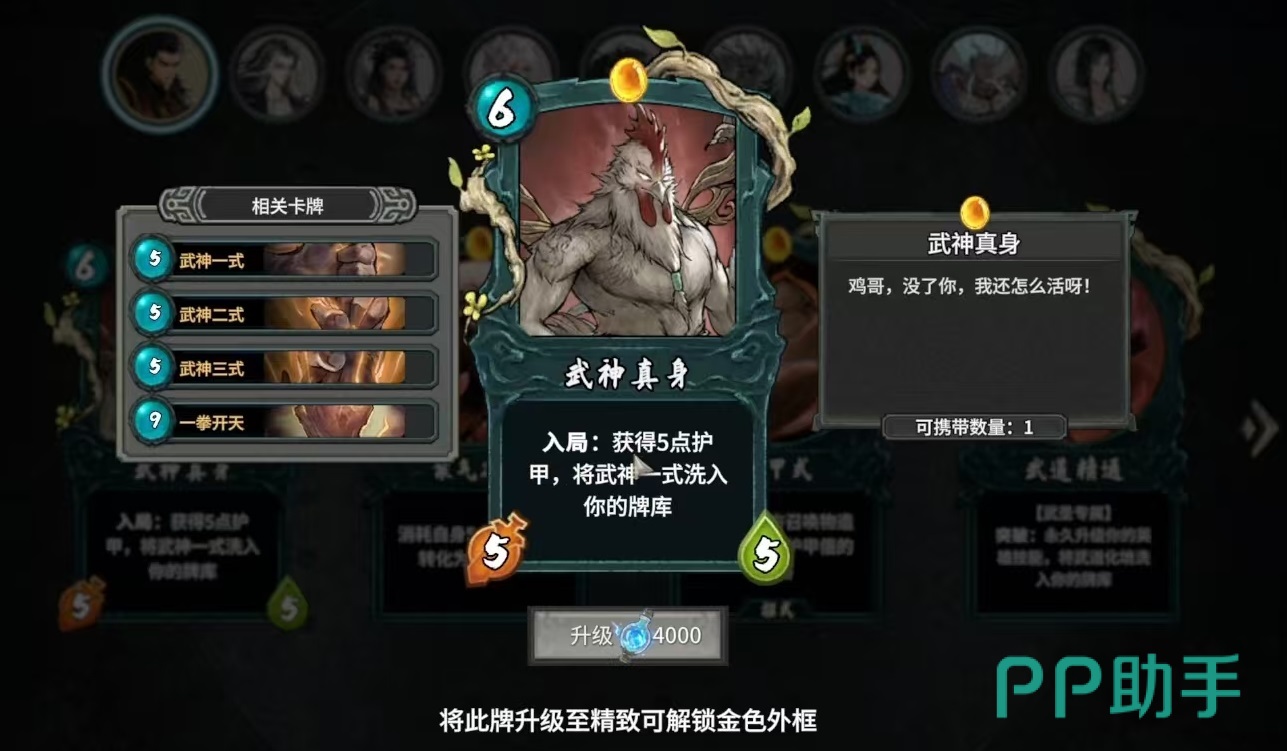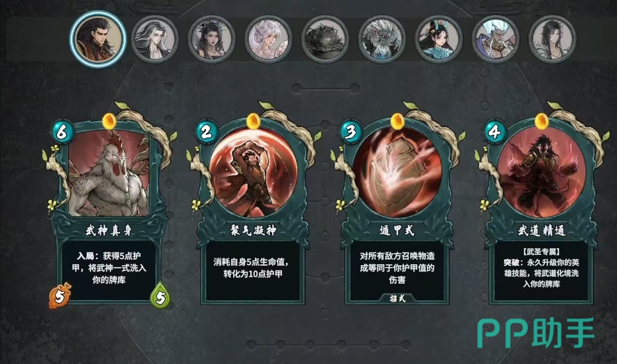 比较出色的英雄武神,它所具有的几张比较出色的本命卡牌是武神真身、一拳开天、聚气凝神、遁甲式、武道精通、金刚护臂、金刚不坏和无畏盾甲。先来看一下武神真身,直接获得5点护甲,将武神一式洗入牌库。一拳开天是非常强势的一招,消耗最多30点护甲,对所有敌人造成所消耗护甲的等量伤害,一拳可以直接打30,是武圣现在非常关键的一张牌。聚气凝神,消耗自身5点生命值转化为10点护甲,这是一张非常优质的叠甲牌,可以更好地叠加,然后打出一拳开天。金刚护臂,本回合中接下来的5张牌转化为消耗的总量护甲,现在武胜了很多套路,这张金刚护臂都是功不可没的。金刚不破是抽三张牌,获得等同于这三张牌能灵力消耗的护甲。