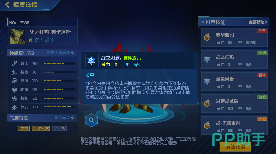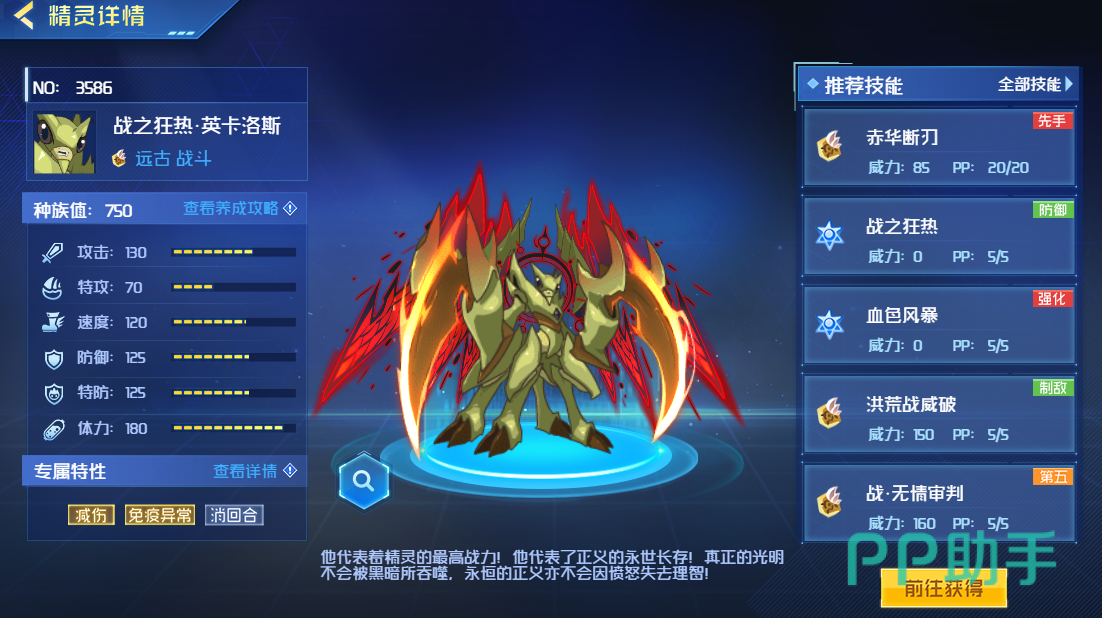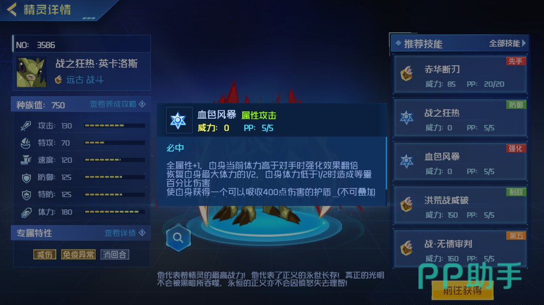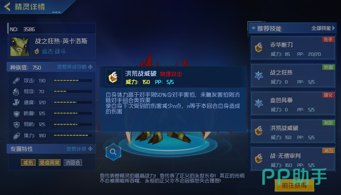 然后大招的话叫做洪荒战威破,如果自身体力高于对方的话,可以让对方处于恐惧状态。没有触发的话就会令自己下次受到更少的伤害,并对对方造成高额物理伤害。然后还有无情审判,用了后就可以消除对手的回合内增益状态,成功后对方无法用技能恢复体力。