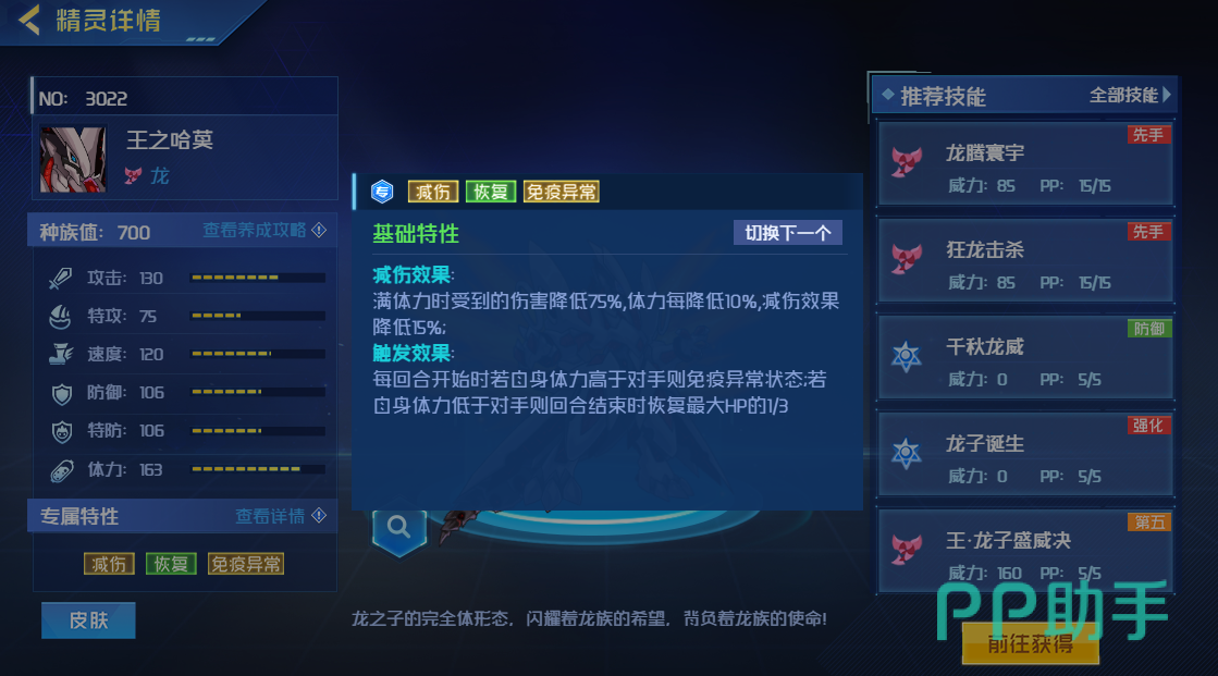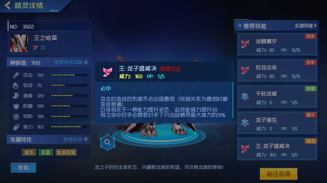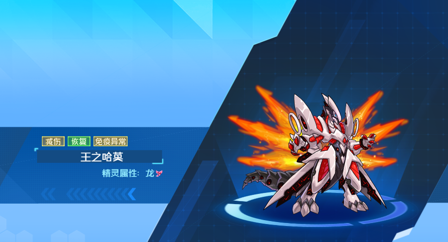 首先王之哈莫是一个龙族精灵,他自身的种族值高达700。并且在队伍中充当主力输出的角色,自身也有着很高额的防御值。不过更高的是攻击力,仿佛能够瞬间绞杀前面的对手。另外它的完全形态是龙之子,并且背负着复兴龙族的使命,浑身散发着强大的王者气息。