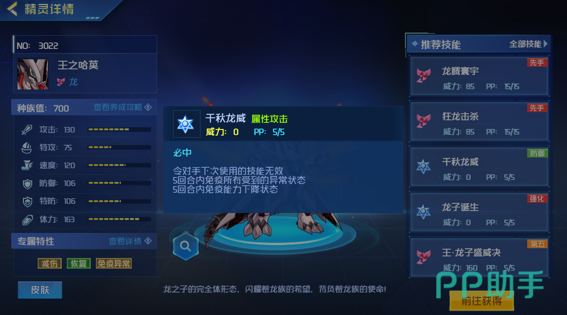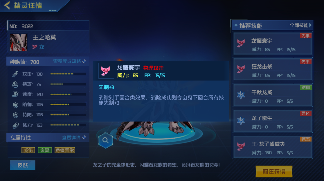然后还可学习千秋龙威,这是一招必中的技能。让对手下次对你的技能无效,这样自身还可以免疫五回合的异常状态,并能让自己的异常状态持续下降,总之可以增强自己的生存和输出能力。还可学习龙子诞生,这招不仅能够增加自身全属性。下次攻击还可以直接忽略对方45%的防御,并恢复自身体力。