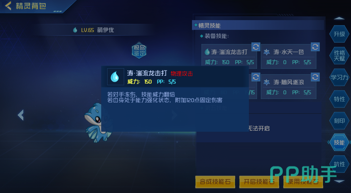 然后还有涛·湍流龙击打,如果对方被你冻住的话,用了之后可以让技能的伤害翻倍。并且自己处于强化状态时,可以附加120点的固定伤害。然后还有随风逐浪,这同样是一个必中的属性攻击,在三回合内自身的免疫力会下降。