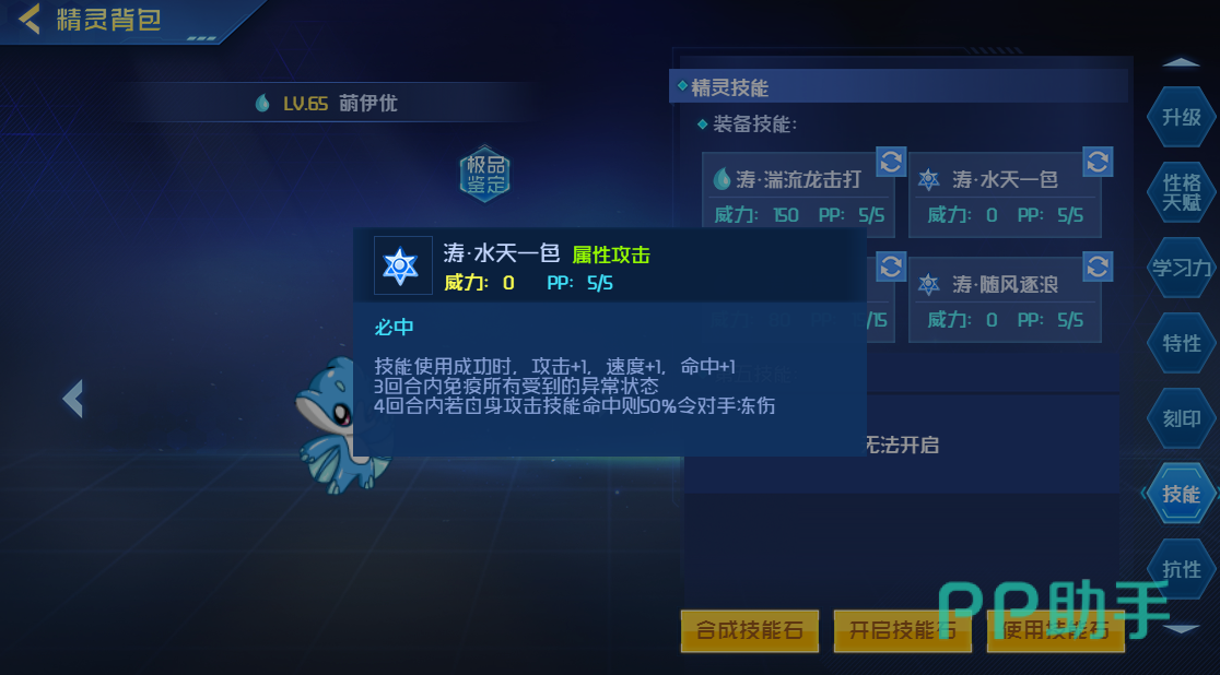 首先讲一下涛·水天一色,用的时候必定能够命中。并且增加速度攻击以及命中率,然后还可以免疫所有所受到的异常状态,并持续三回合。如果在四回合内自身的攻击命中对方的话,还有50%的概率冻住对方,所以是个优秀的先手控制手段。