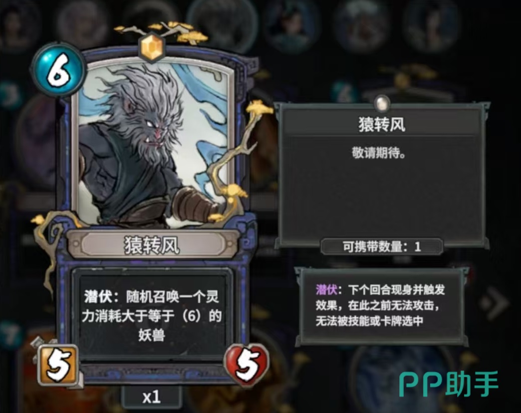 第5张猿传风,潜伏效果,随机召唤一个灵力消耗大于或等于6的妖兽,潜伏需要下回合现身定触发效果,在此之前无法攻击,无法被技能或卡牌选中。第6张是烈焰巨猿,当从手牌中将其使用时就会触发入局效果,攻击两次,相当于7费打12,在收益方面还是非常不错的,不过依然存在费率过高的问题。