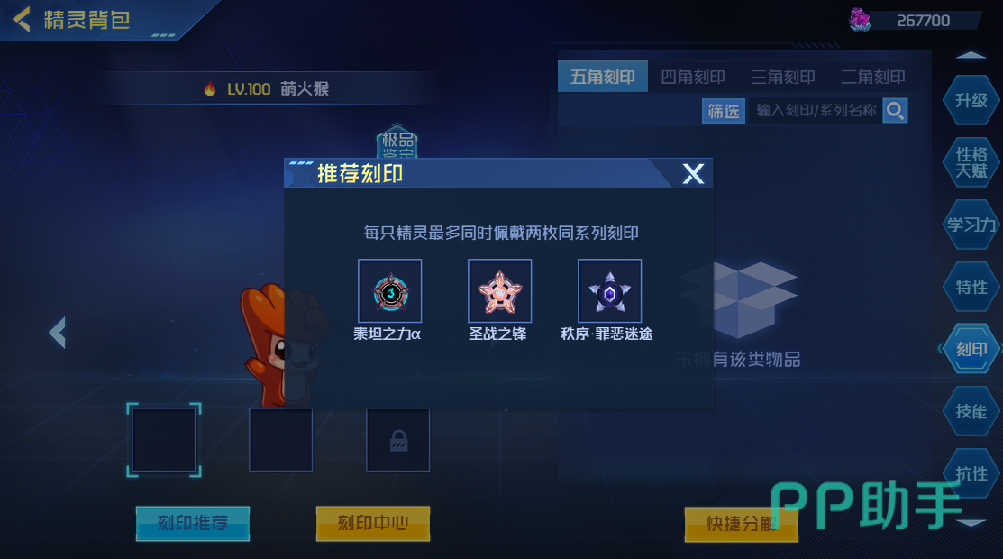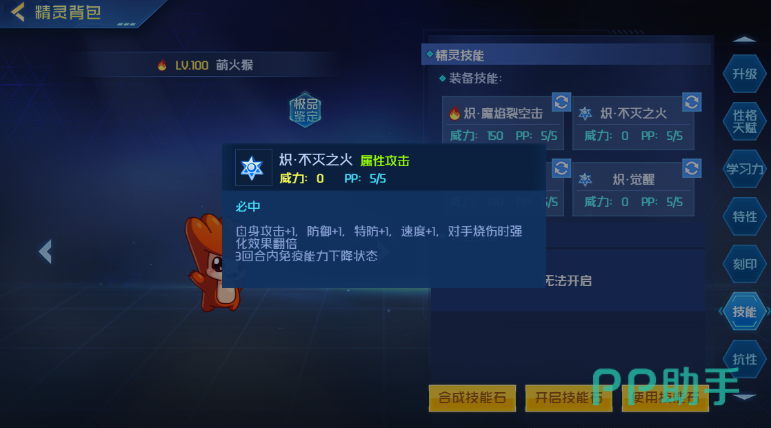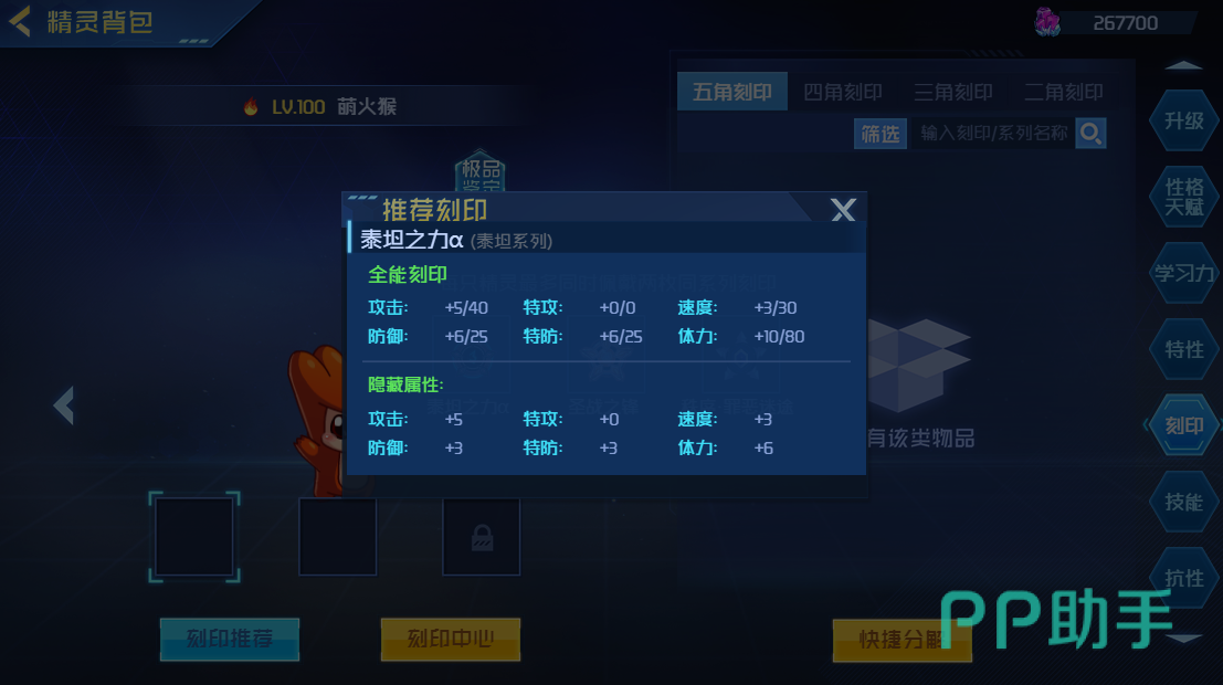 如果想要进一步发挥萌火猴的实力,那你就要佩戴正确的刻印了。这里推荐泰坦之力,用了之后就可以提升高额的攻击力以及速度,另外自身防御力也会大大提升,可以免疫对方对你造成的伤害,还能获得一些隐藏属性。