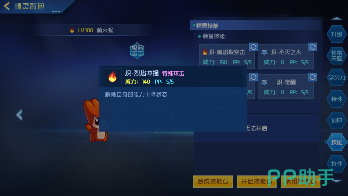 然后还有特殊攻击—烈焰冲撞,可以让他直接冲向敌人,并发起猛烈一击。威力高达140点,然后他的大招叫做炽·觉醒,能够免疫三回合内所受到的所有异常状态。然后恢复自身1/4的体力,对方使用属性技能的话就有一定的概率灼烧对方,让其自己阵亡。