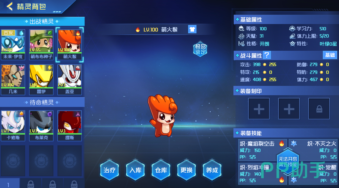 萌火猴是一只火属性的精灵,他的攻击力非常高,并且有着更快的攻击速度。更加偏快节奏输出,不过自身的防御力以及体力不算太高,所以在场上更需要一些治疗型精灵去辅佐作战。因为他的性格开朗,切换后就可以获得更快的攻击速度。