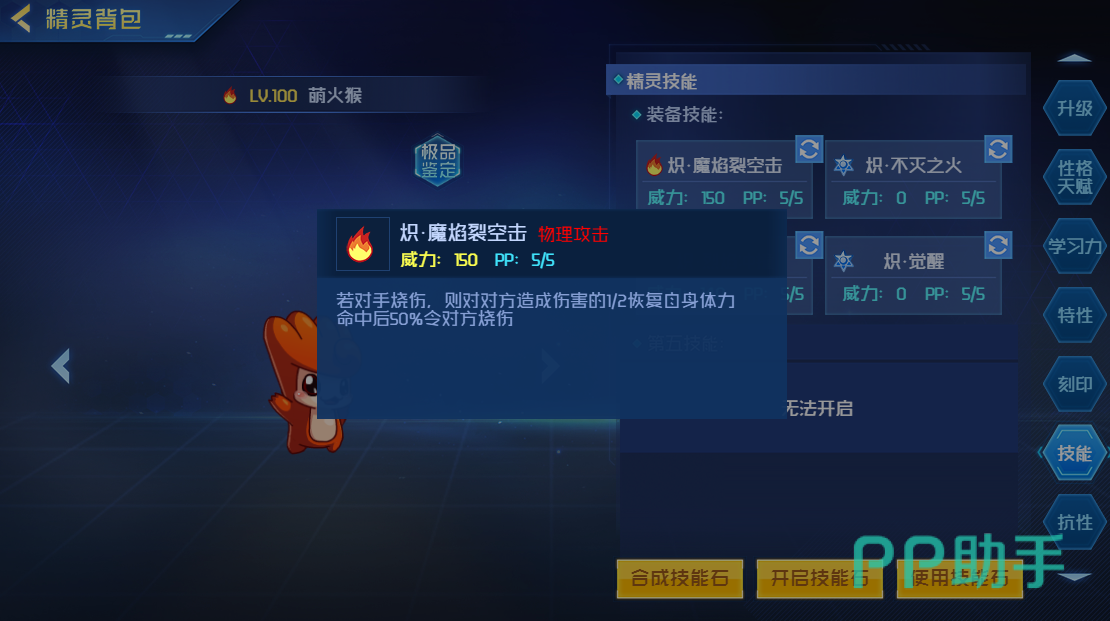 他的第一技能叫做炽·魔焰裂空击,用了可以对敌人造成火属性伤害。若对手烧伤,则对对方造成伤害的1/2恢复自身体力。命中后50%令对方烧伤,所以用了它之后就不用担心自身体力不足,可以源源不断发挥自身实力。