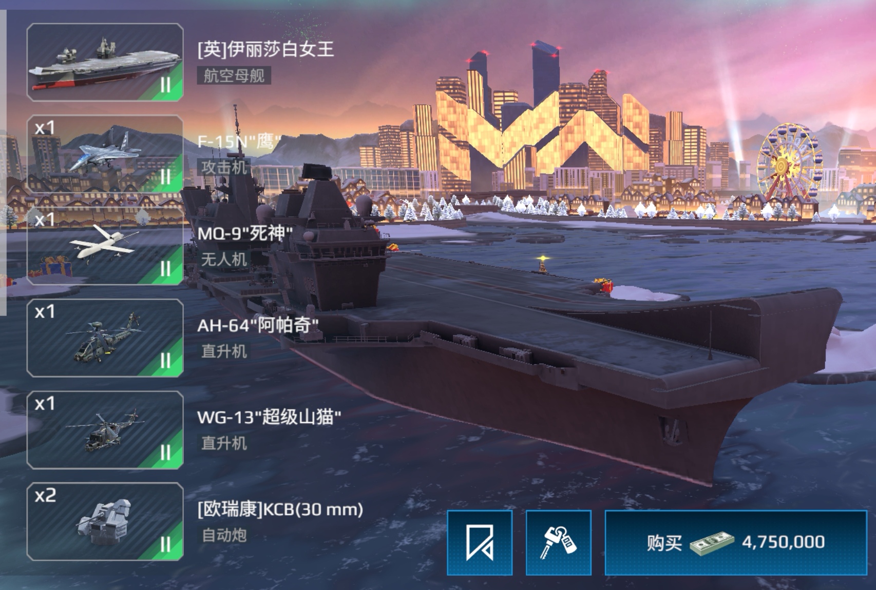 尼米兹号是一艘性能较为均衡的航母,拥有极高的耐久度,可以抵挡对手的进攻,期间还能进行自我修复,延长舰艇的续航时间,这个航母上配备了雄猫攻击机和大黄蜂战斗机,还有死神无人机和鱼鹰直升机,玩家在实战中,可以派出这些飞机去袭击敌人,也可以借助它们争夺制空权,为己方舰队积累优势,它自身携带的各型舰炮和对空武器,能有效拦截来袭的敌机和导弹,保护舰艇不受伤害。