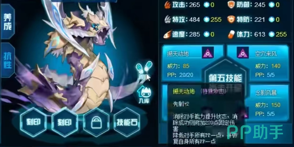 它的主要技能包括能量契约、撼天动地、巨质凝缩、深渊契约、念影风暴、伟力穿透等。能量契约,技能使用成功时,100%改变自身攻击等级+2,技能使用成功时,100%改变自身特攻等级+2。撼天动地,能消除对手能力提升状态,如果消除成功还能附加220点固定伤害,降低对手所有的pp,降低一点自身就能恢复一点。巨质凝缩,该技能必中,三回合内可免疫所有受到的异常状态,另外在三回合内,每回合都能降低对手两点攻击,两点特攻,两点速度和两点命中,自身每处于一种能力提升状态,还能额外附加100点护盾。
