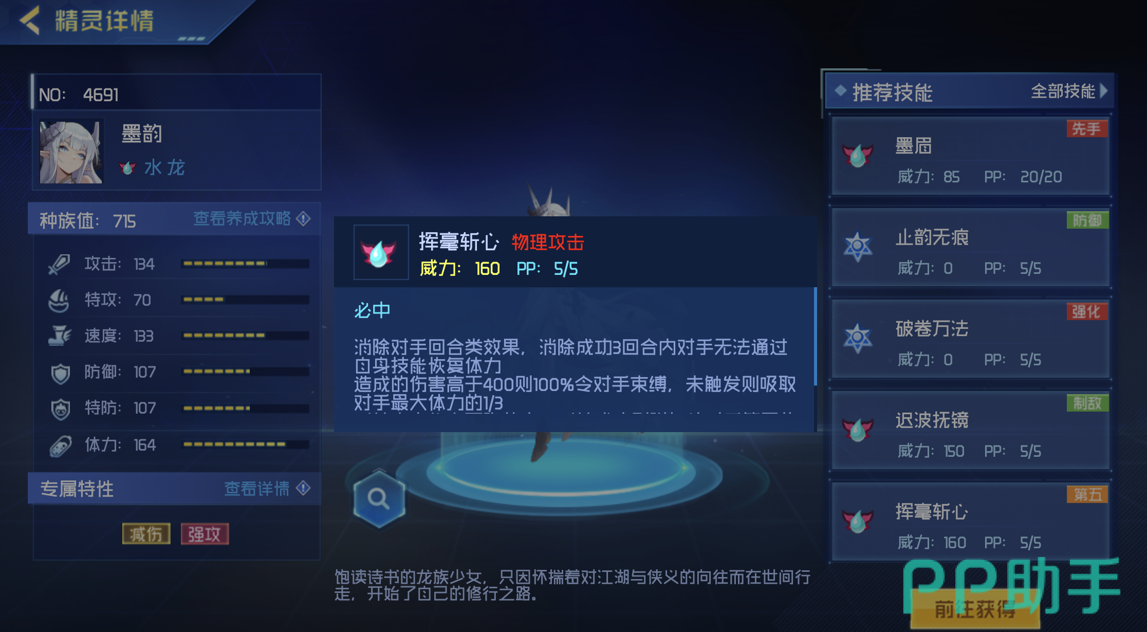 【挥毫斩心】是墨韵的主要输出技能,不仅必定命中,还可以消除对手的回合类效果,并限制对手的体力恢复能力。当技能伤害高于400时,会100%令对手陷入束缚状态,未触发时还能吸取对手的体力,并通过反转自身的能力下降来削弱敌方,是一项兼具输出和控制的强力技能。