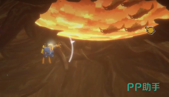 接下来,利用火山喷发制造的岩浆,你会看到一颗树脂球正好落在上方。把它扔向左侧高处的门,就能成功炸开这扇阻挡你去路的大门。