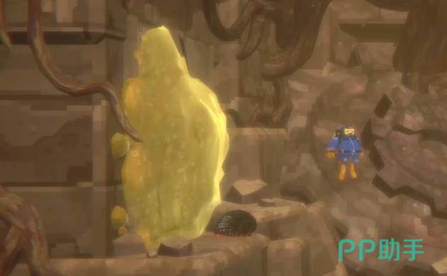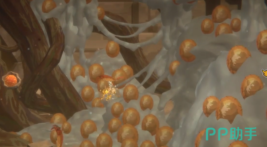 接着进入一个新房间,你会遇到一只脾气暴躁的海虾。这家伙不好惹,但打败它后,树上的树脂球就会变成你的工具。用它砸向地面的树脂口,一次性解决掉障碍,顺利通往下一层。
