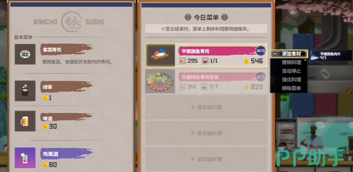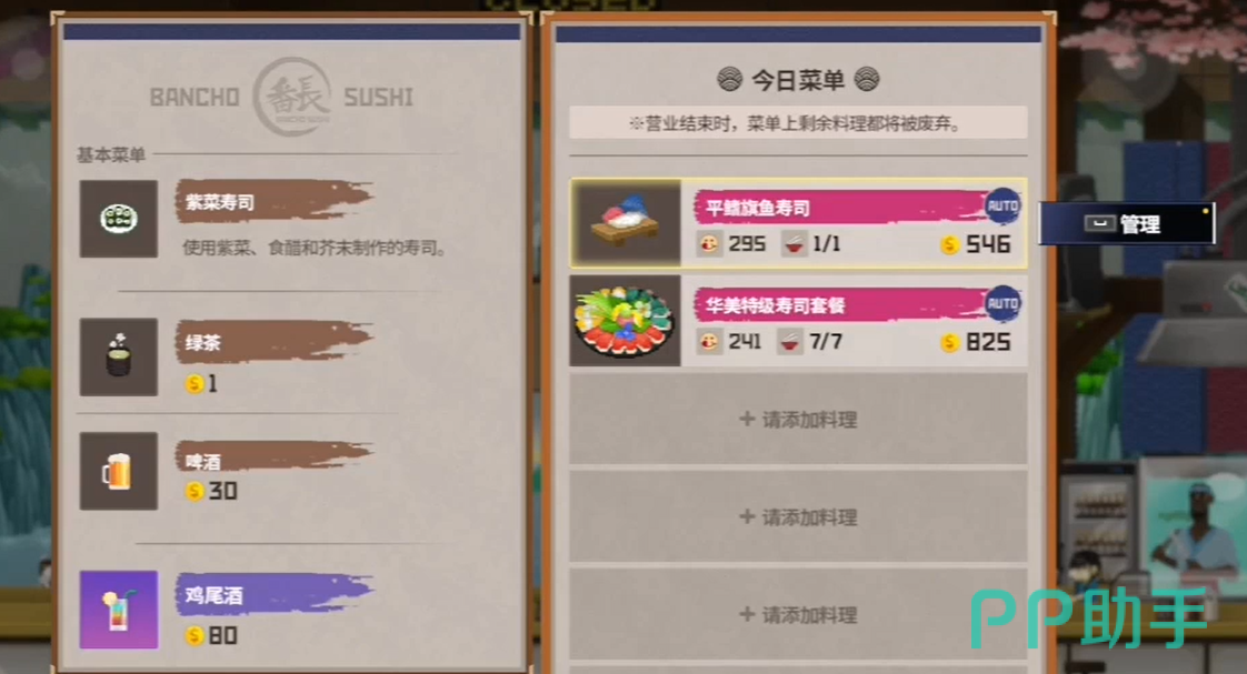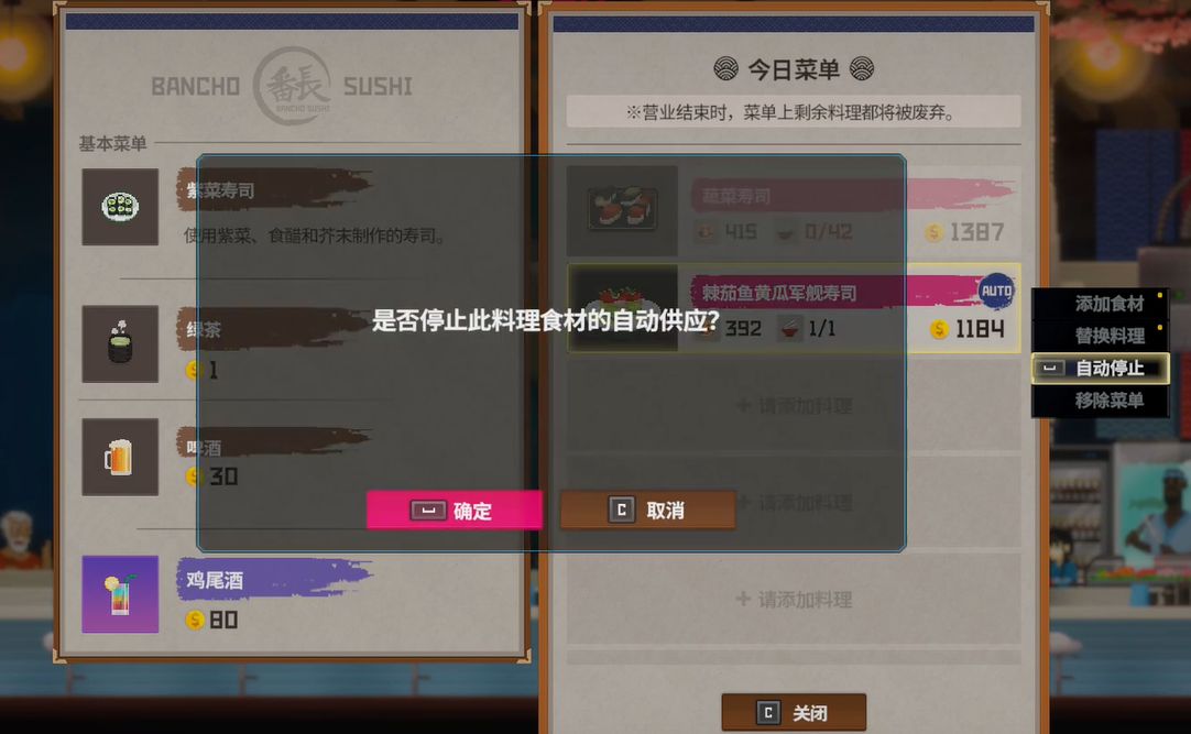 一句话来说,“自动供应”就是帮你从仓库中自动调取食材,免去了手动补货的麻烦。每天寿司店开门前,你需要提前准备当天的食材库存,如果开启了自动供应功能,那么当店里的食材不足时,系统会自动从仓库里调用剩余的食材,直接填补库存。如果这个功能没有打开,就意味着当食材用光时,店员只能抱歉地告诉顾客“无货”,你不仅会失去顾客满意度,还会浪费原本可以赚取的收益。